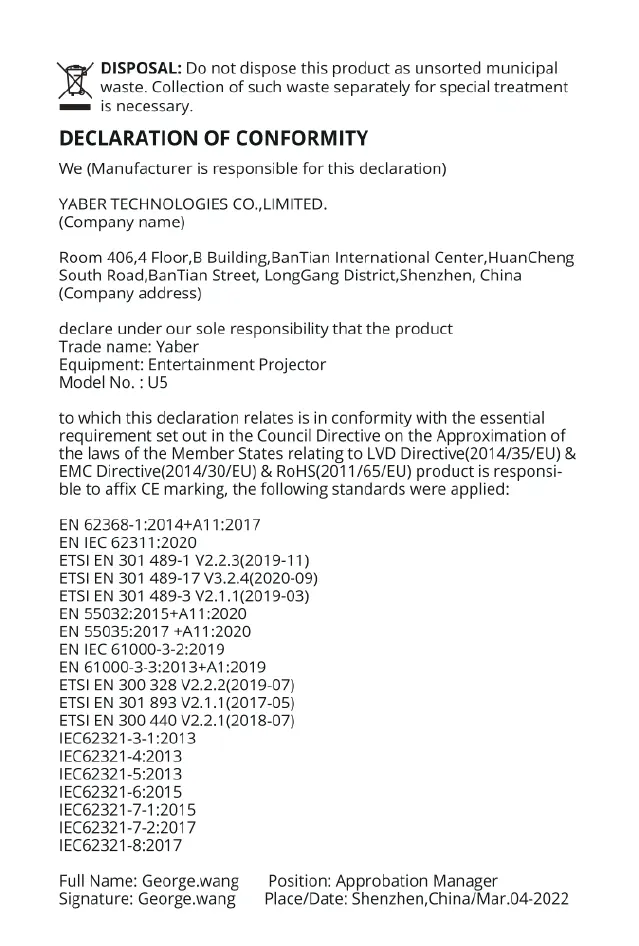 Yaber U5 - DECLARATION OF CONFORMITY