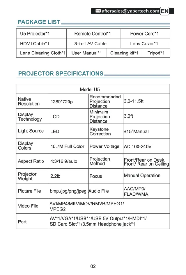 Yaber U5 - PACKAGE LIST; PROJECTOR SPECIFICATIONS