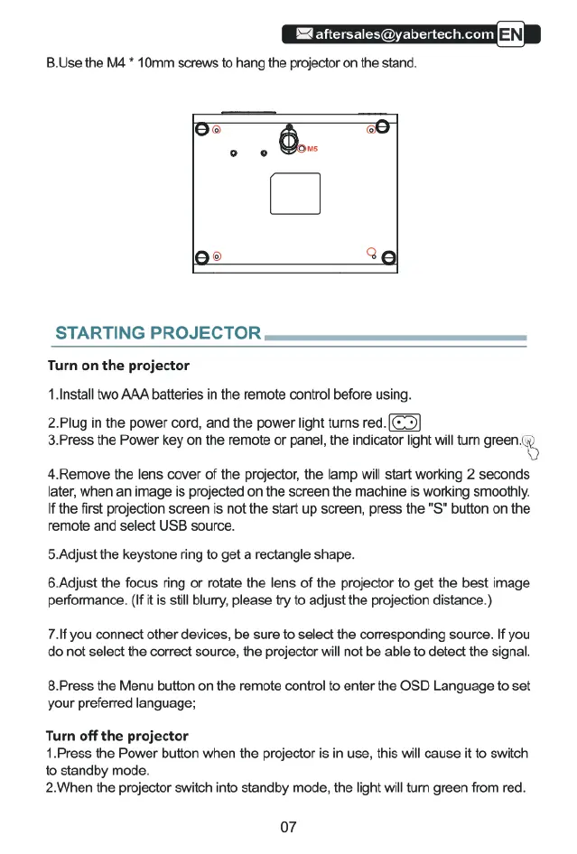 Yaber U5 - STARTING PROJECTOR; Turn on the projector; Turn off the projector