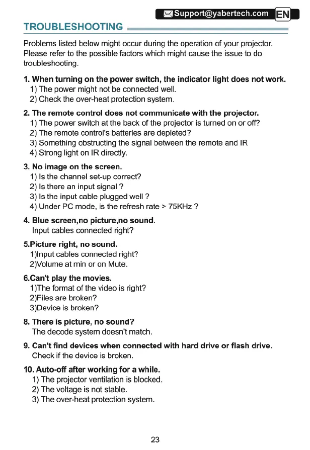 Yaber V10 - Troubleshooting Common Issues; Power Indicator Not Working; Remote Control Communication Failure; No Image on Screen