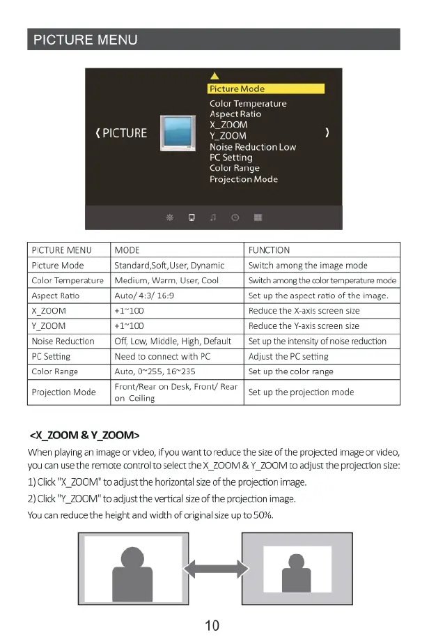 Yaber Y21 - Menu Settings; Picture Menu Settings; X_ZOOM & Y_ZOOM