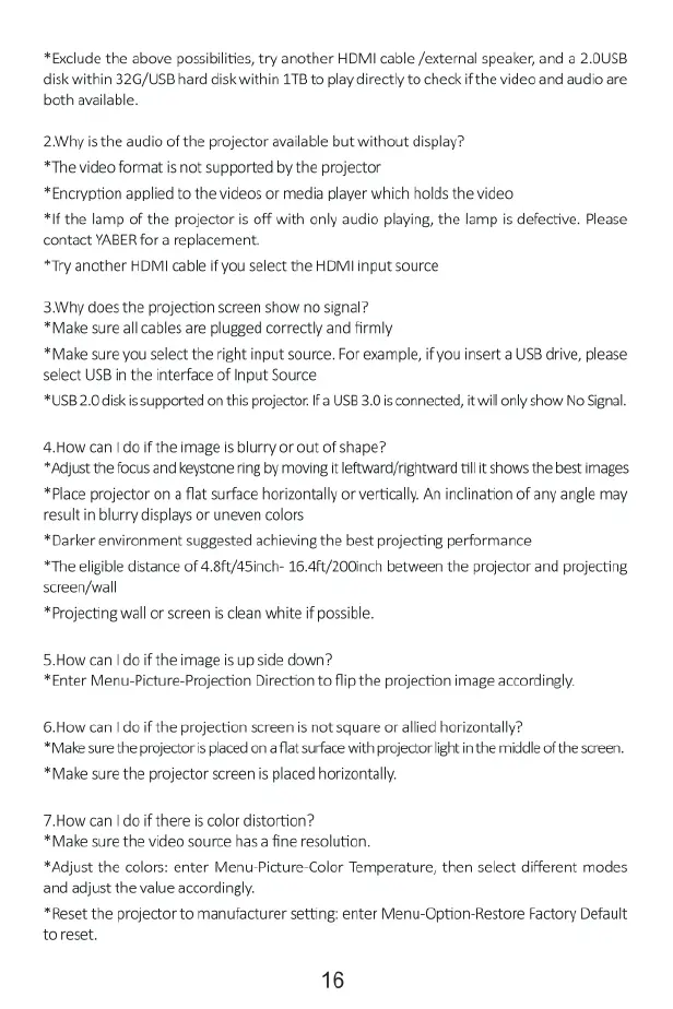 Yaber Y21 - Blurry or Out of Shape Image; Upside Down Image; Non-Square Projection; Color Distortion