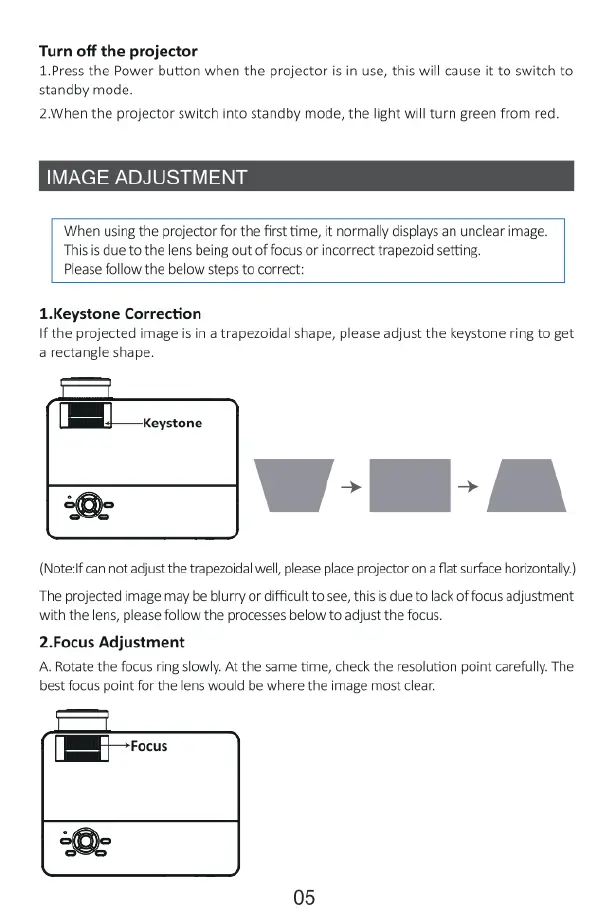 Yaber Y21 - Image Adjustment; Keystone Correction; Focus Adjustment