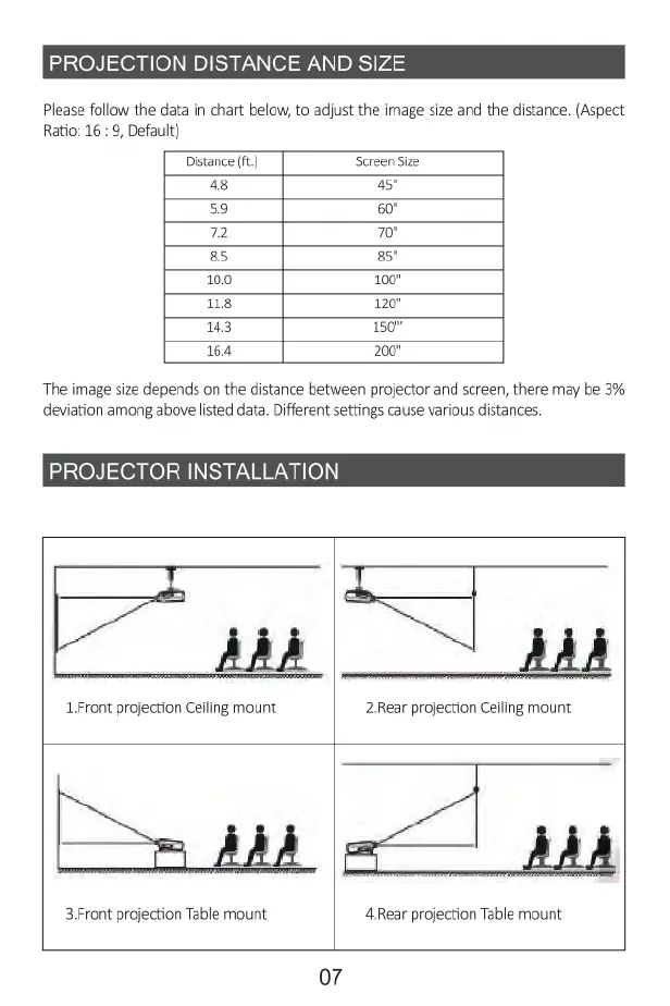 Yaber Y21 - Projection Distance and Size; Projector Installation