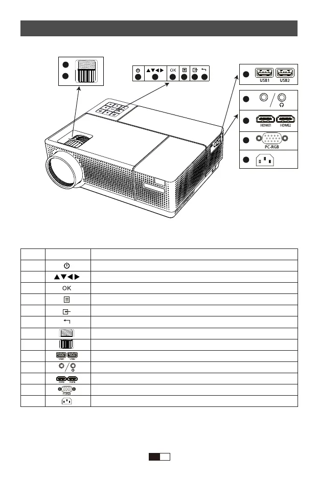 Yaber Y31 - プロジェクターーの各部の説明; 全面図