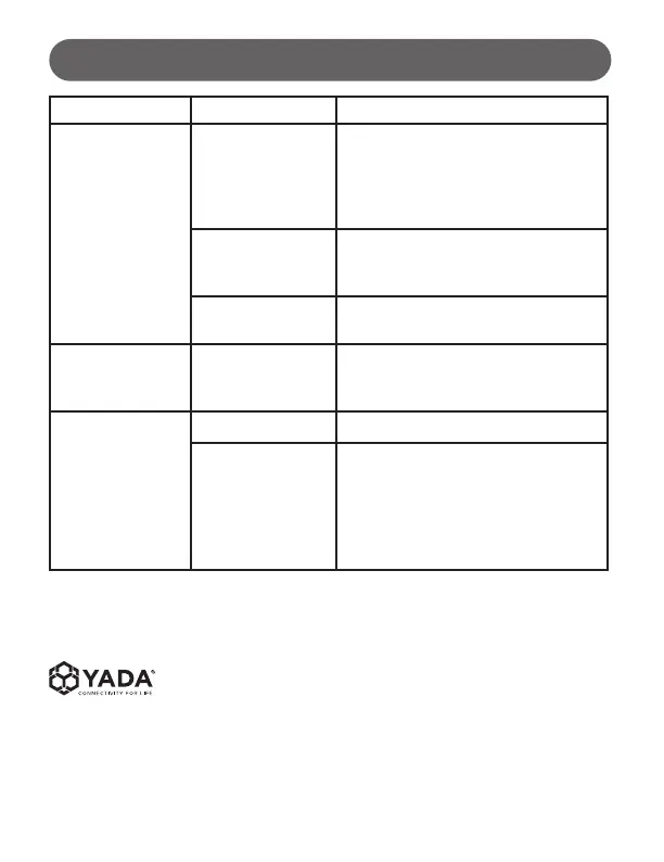 Low battery status Recharge the unit via USB cable until