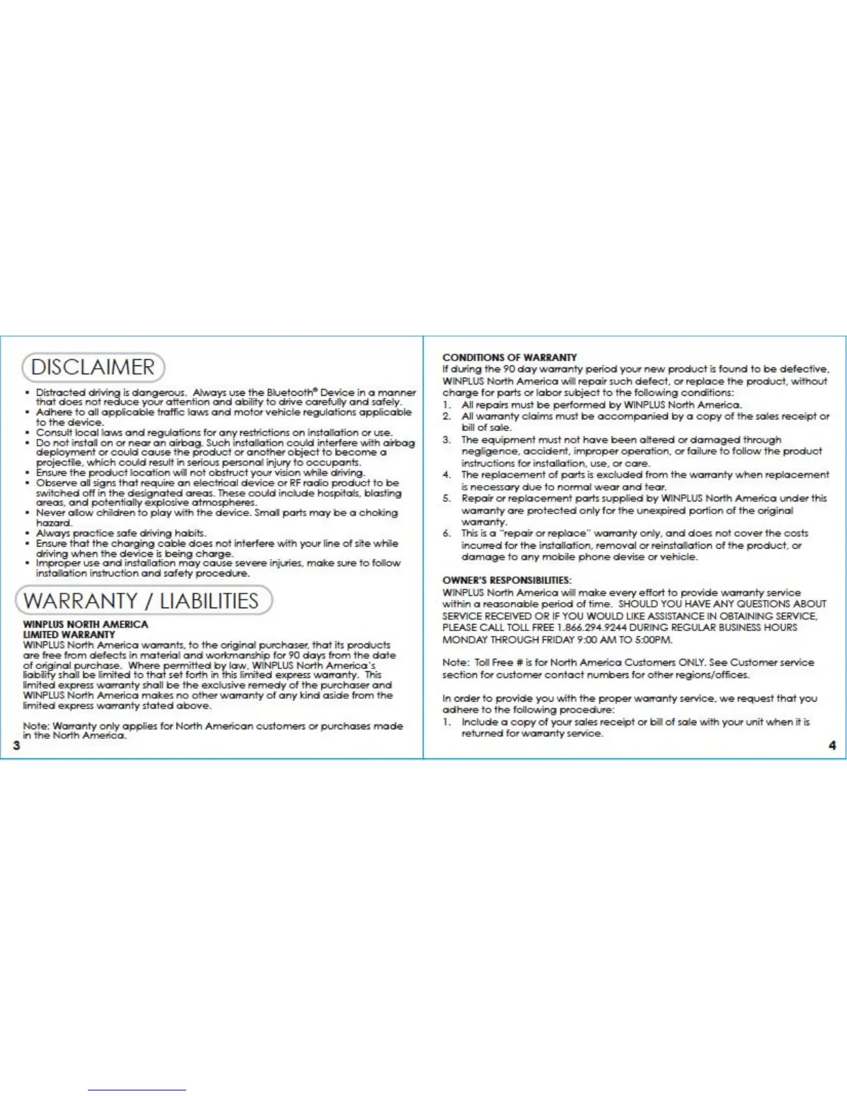 Yada yd-v16 - Disclaimer; Warranty and Liabilities; Conditions of Warranty; Owners Responsibilities