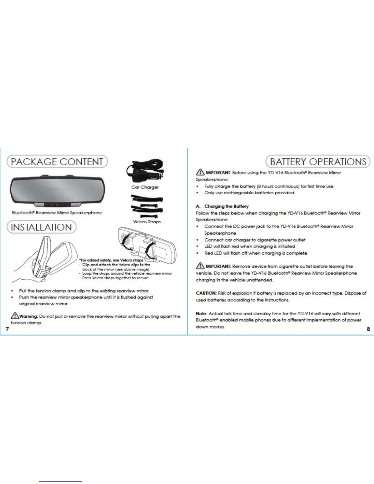 Yada yd-v16 - Package Content; Installation; Battery Operations; Charging the Battery