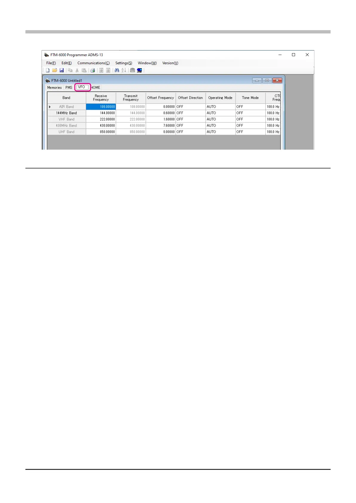 Enter the VFO frequencies for each band. The FTM-6000R/E default Frequencies are pre-entered into the