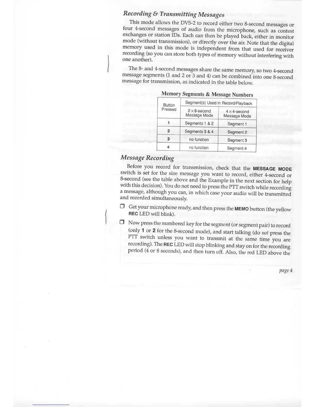 Yaesu DVS-2 - Recording and Transmitting Messages; Memory Segments and Message Numbers; Message Recording Procedure