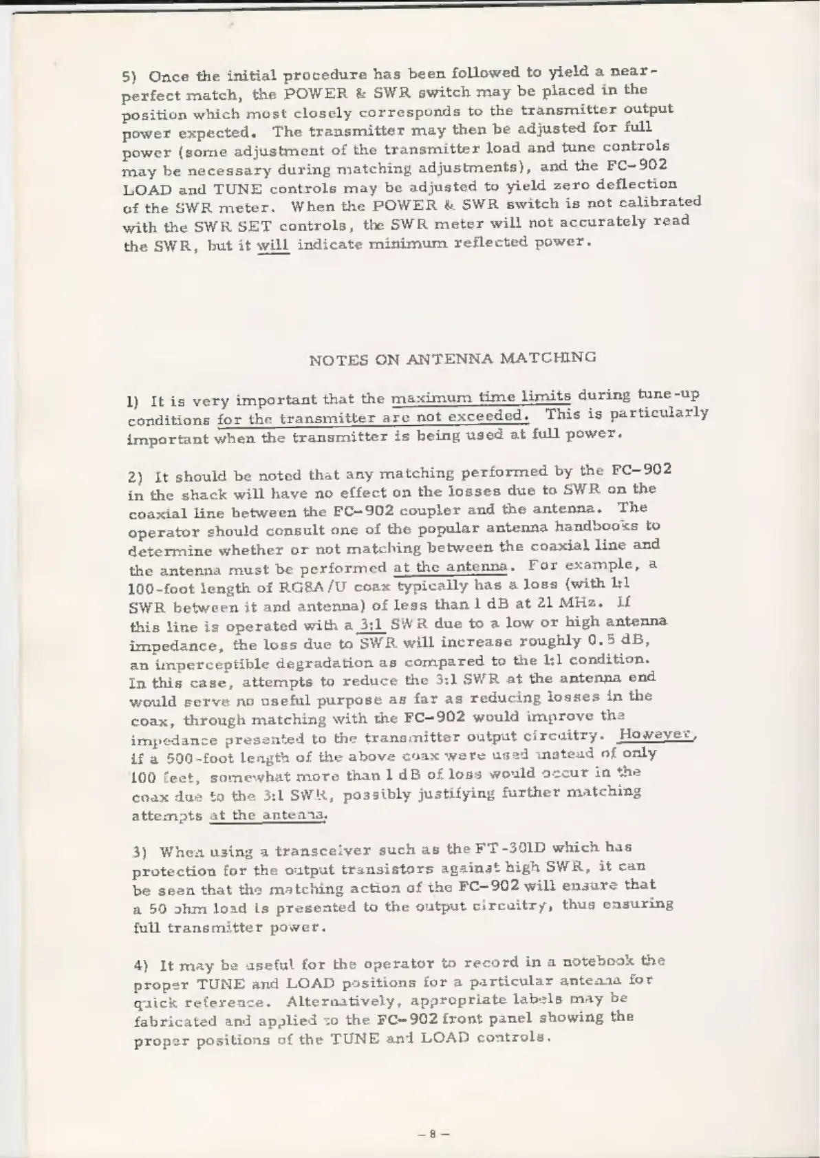Yaesu FC-902 - Notes on Antenna Matching; Tune-up Time Limits; Shack Matching vs. Line Losses; Transceiver Protection