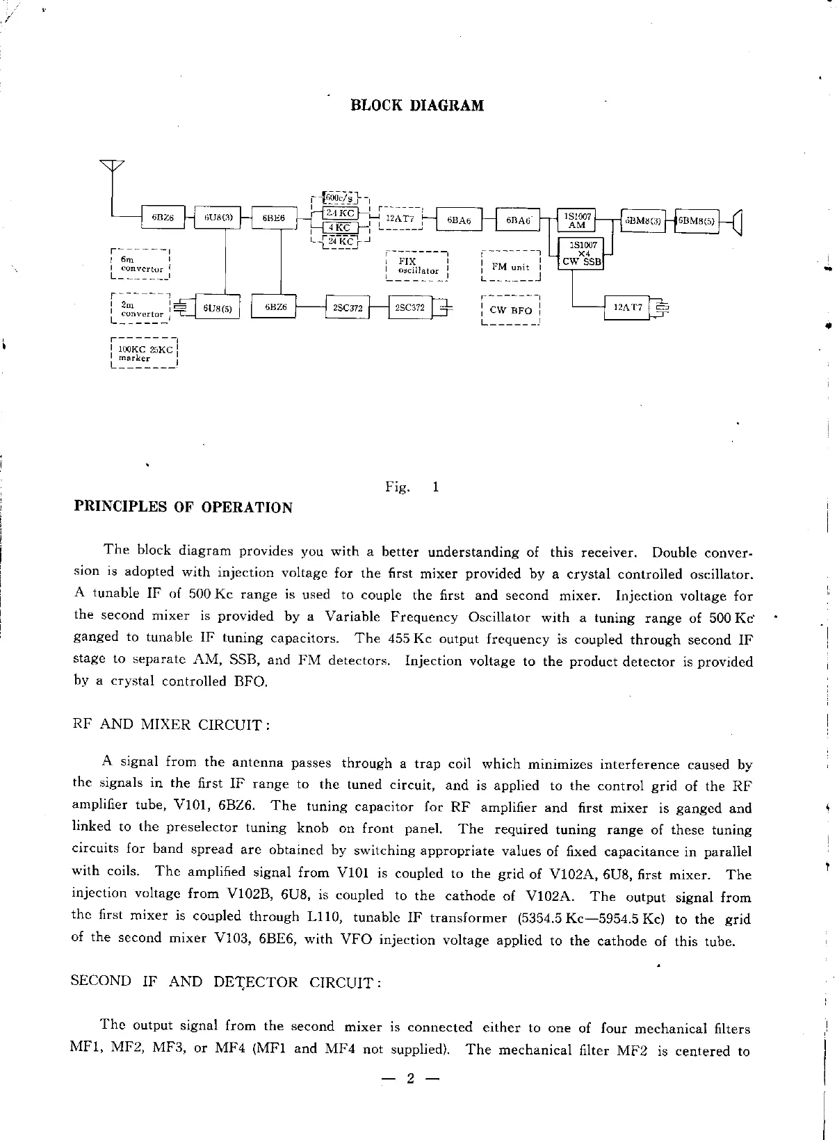 Yaesu FRDX-400 - BLOCK DIAGRAM; PRINCIPLES OF OPERATION; RF AND MIXER CIRCUIT; SECOND IF AND DETECTOR CIRCUIT