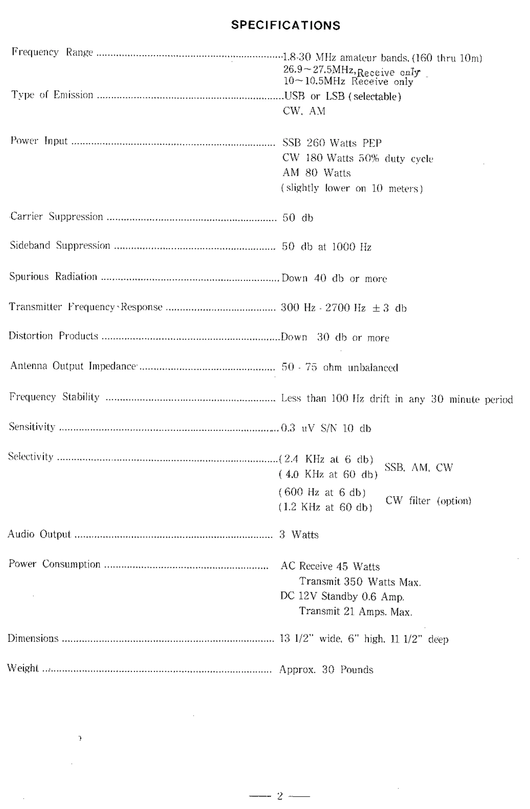 Yaesu FT-101B - SPECIFICATIONS; Technical Performance Data
