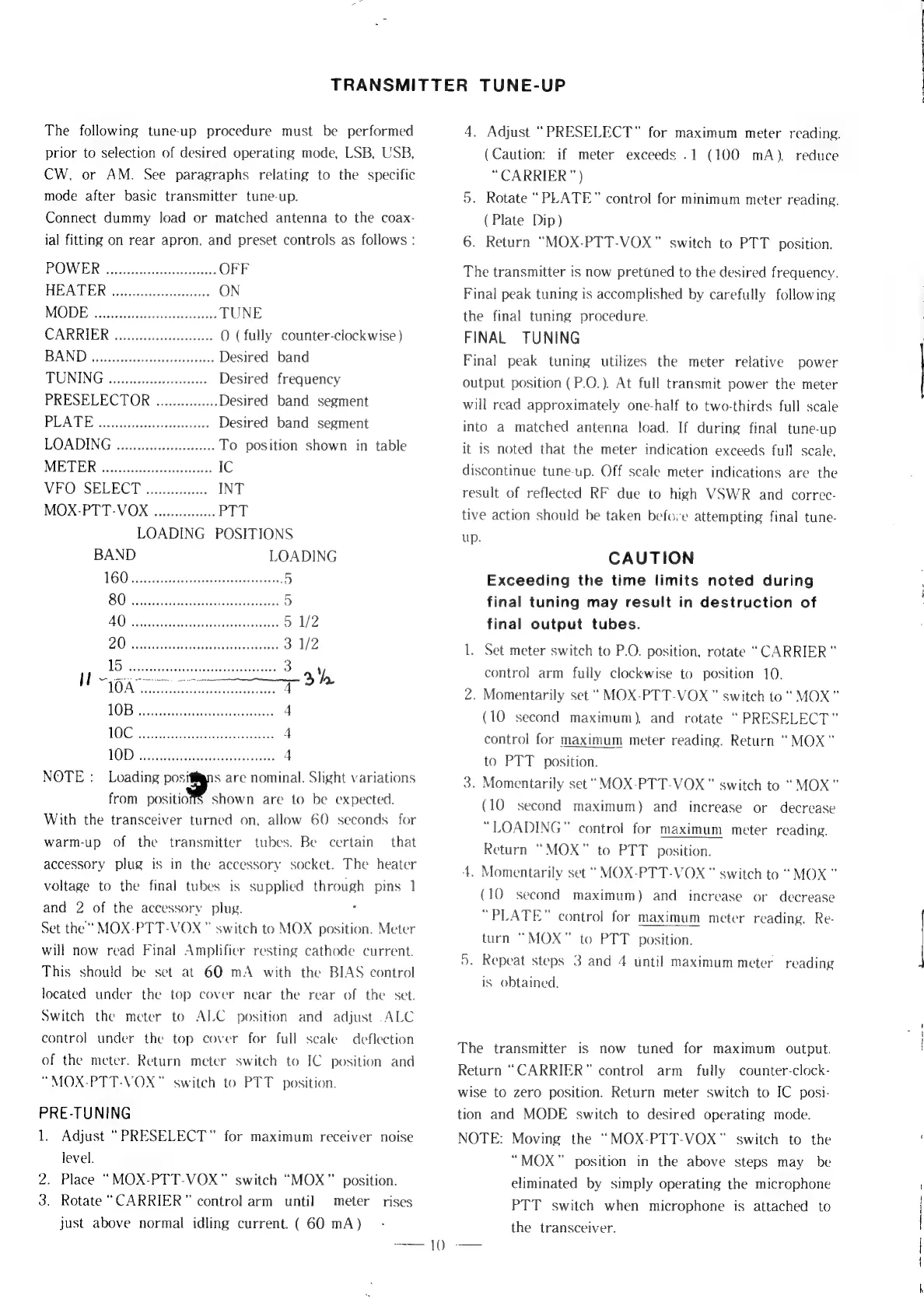 Yaesu FT-101E - TRANSMITTER TUNE-UP; PRE-TUNING; FINAL TUNING