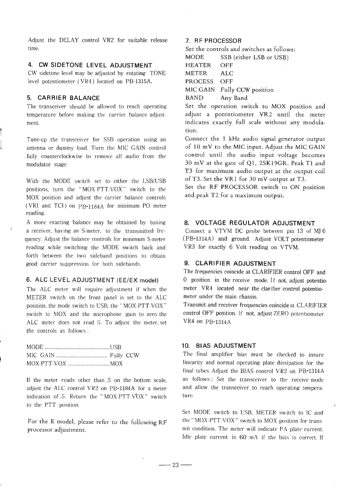 Yaesu FT-101EE - CW Sidetone, Carrier Balance, and ALC Adjustment; RF Processor, Voltage Regulator, and Clarifier Adjustment; Bias and Power Output Meter Adjustment
