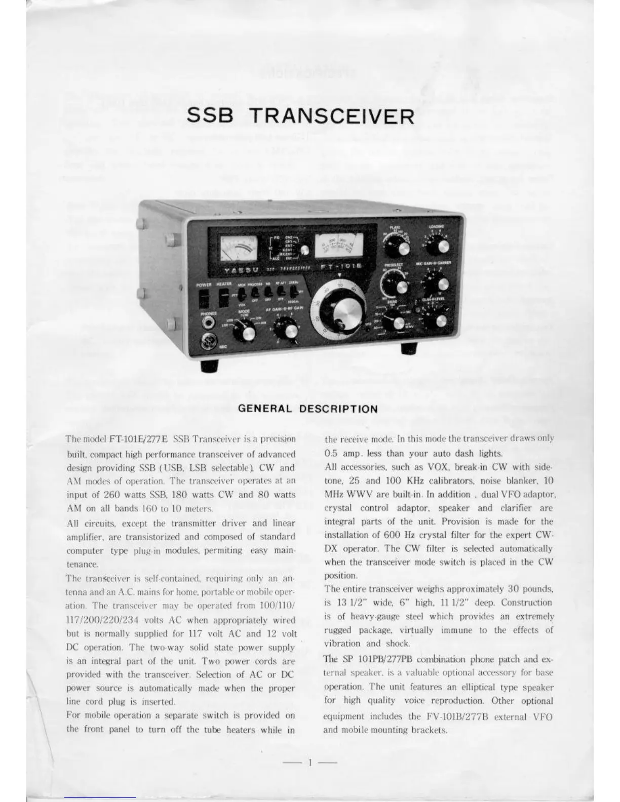 Yaesu FT101-EE - General Description; Features and Modes of Operation; Construction and Self-Containment; Power Sources and Mobile Operation