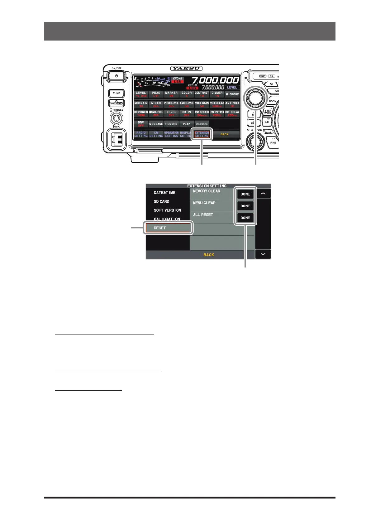 Press the [FUNC] knob → touch [EXTENTION SETTING] → touch [RESET]