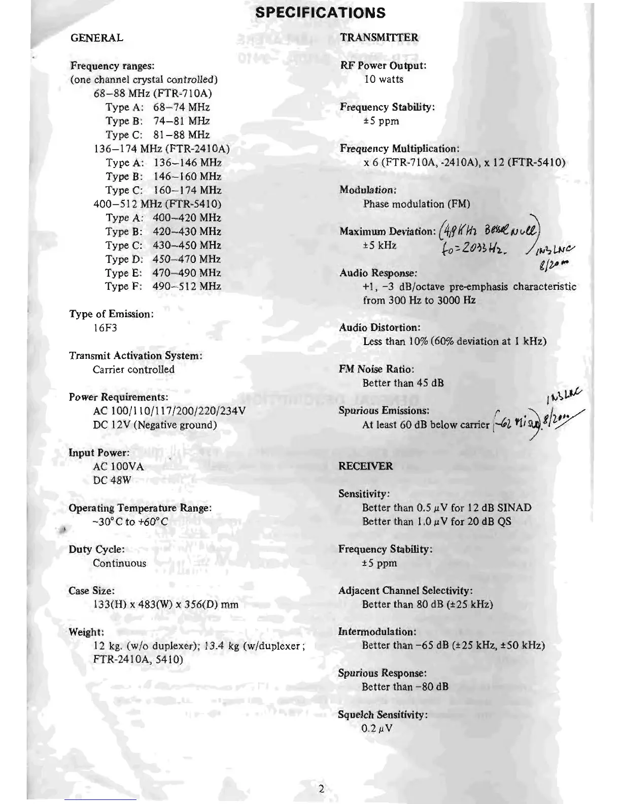 Yaesu FTR-710A - SPECIFICATIONS; Transmitter Specs; Receiver Specs