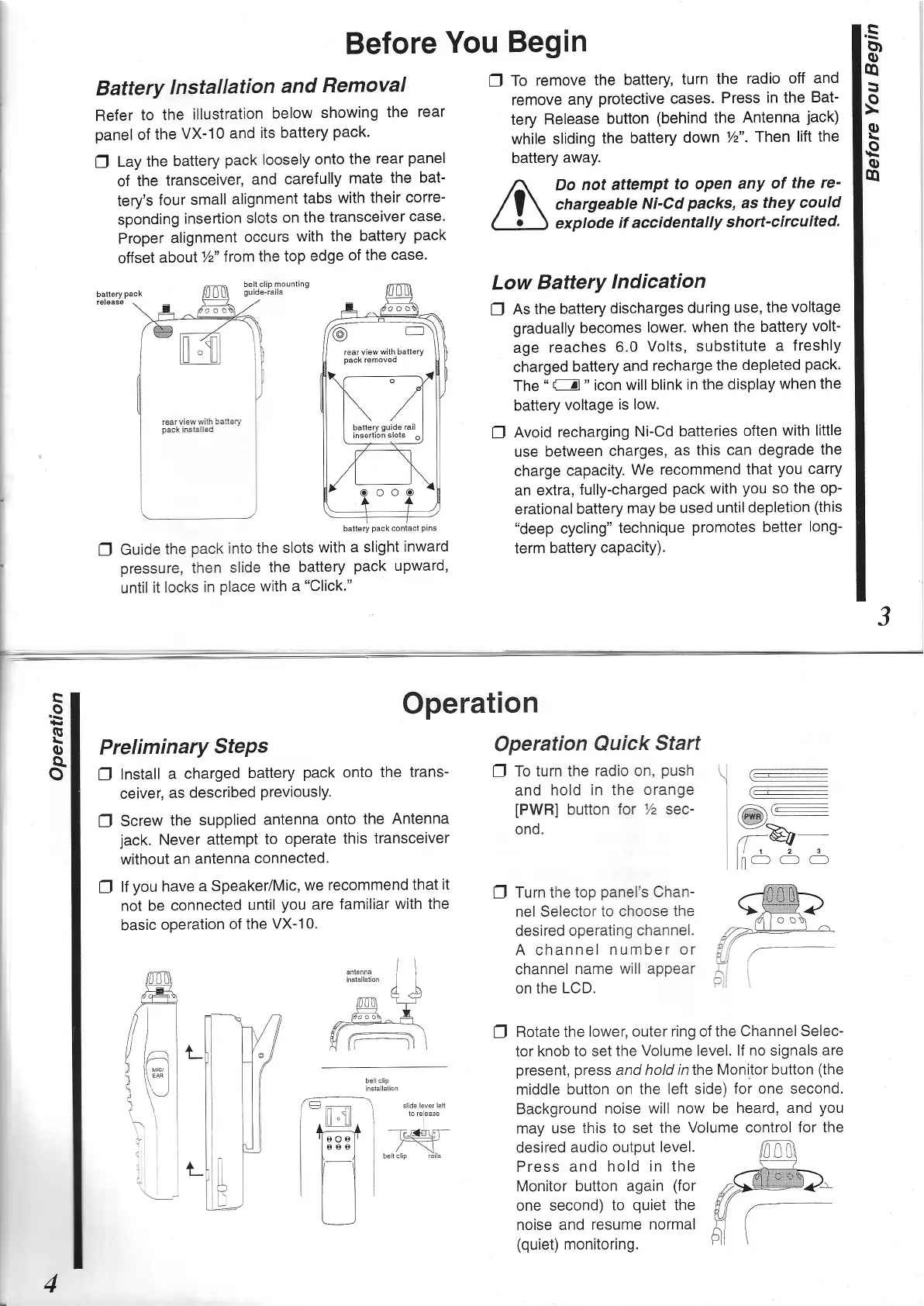 Yaesu VX-10 - Initial Setup and Operation; Battery Installation and Removal; Low Battery Indication; Preliminary Steps