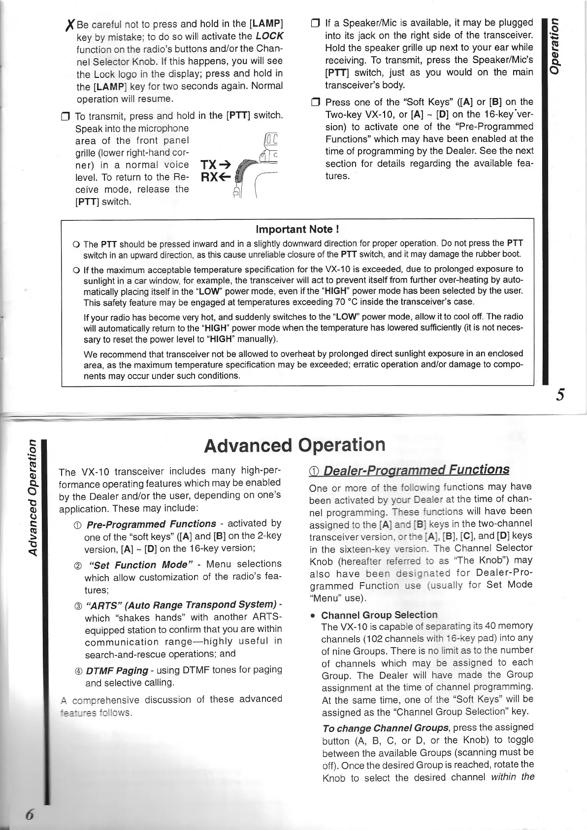 Yaesu VX-10 - Advanced Operation Features; Lock Function; Transmitting Procedure; Speaker;Microphone Usage
