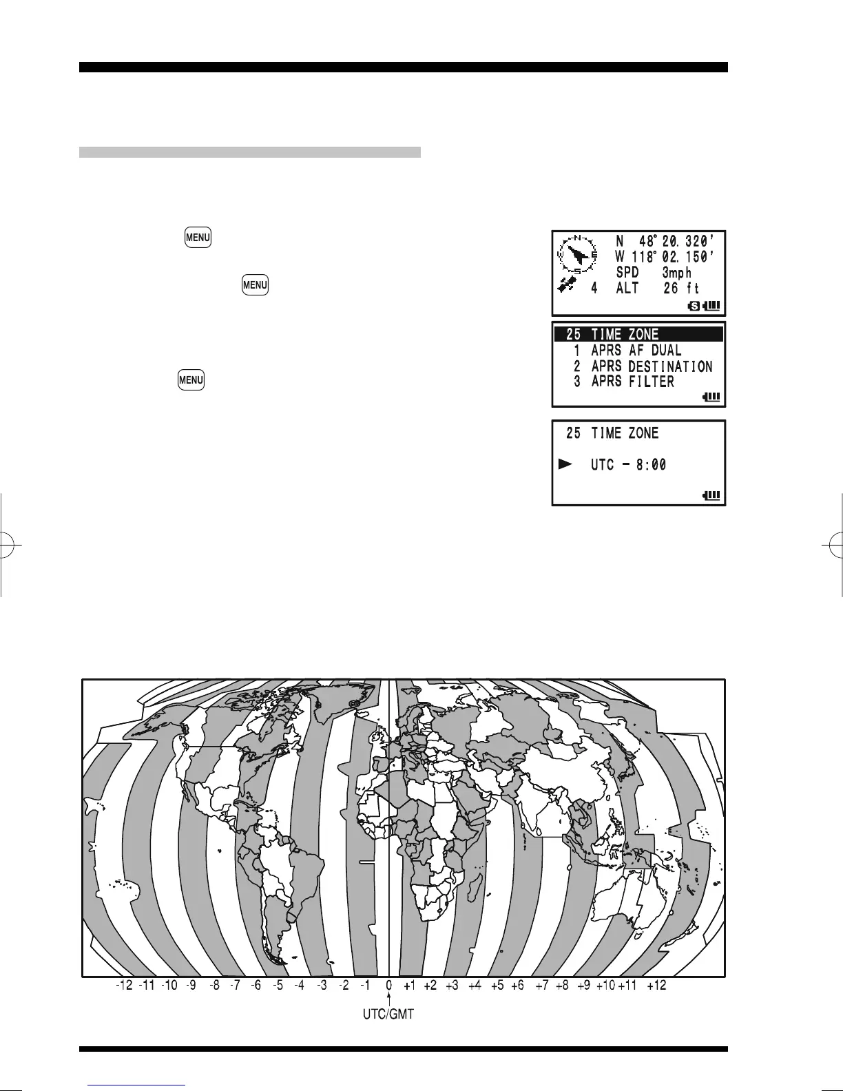 You may cu st omize the Ti me Zone ( Time Off se t) , Displa y Unit of the GPS s cr een, and