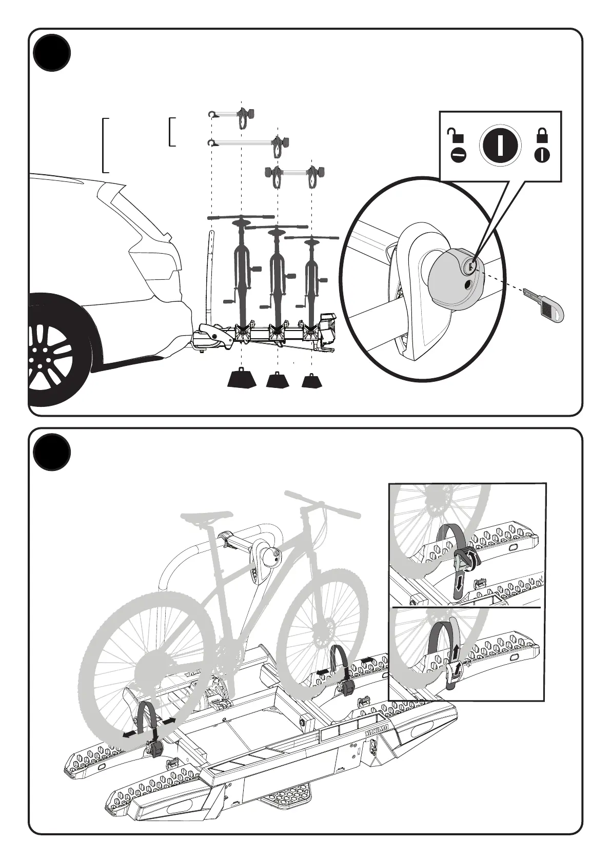 Secure bikes to carrier using the wheel straps and buckles.