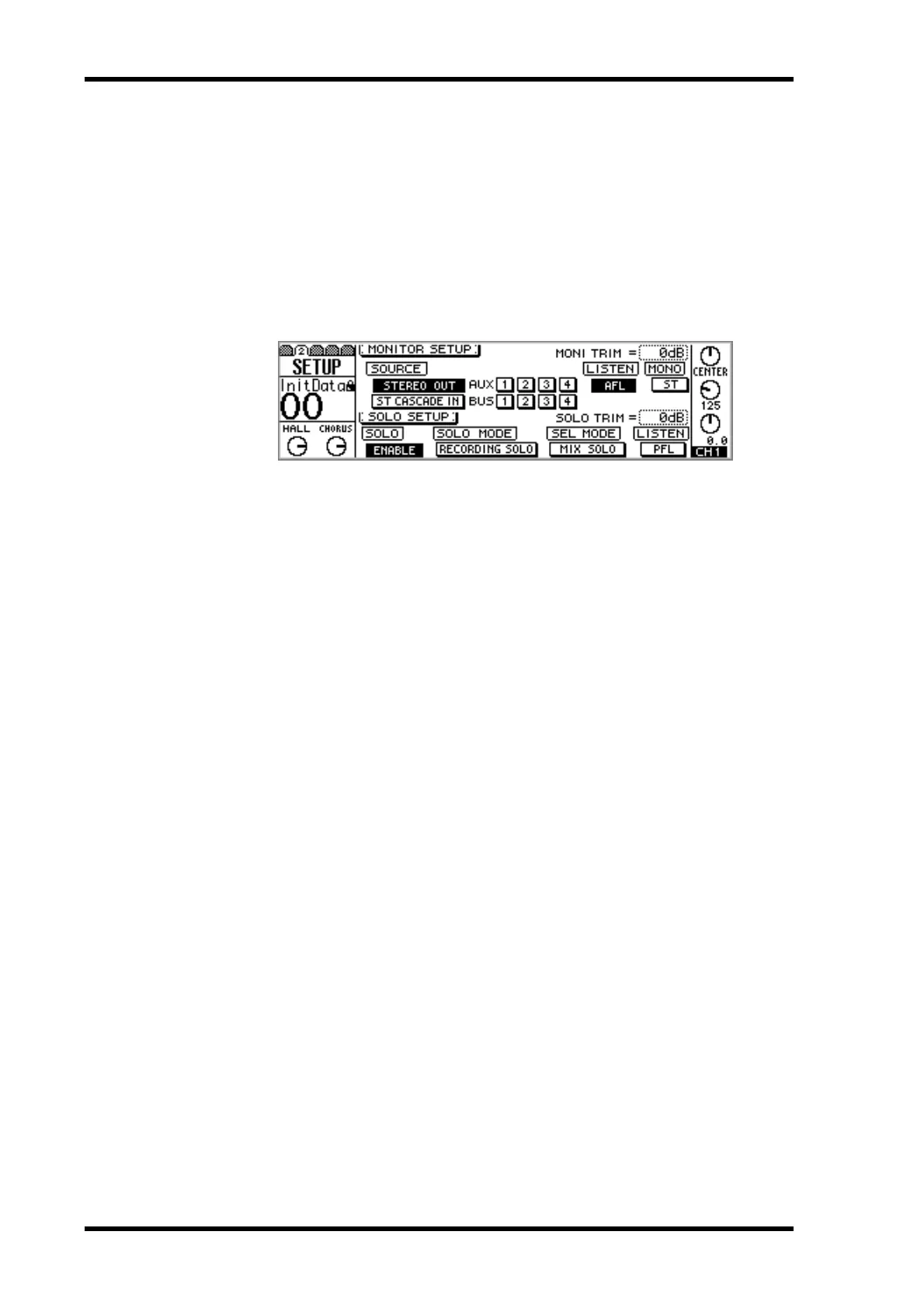SETUP page 2. Solo has priority over the sources selected using the MONITOR SETUP