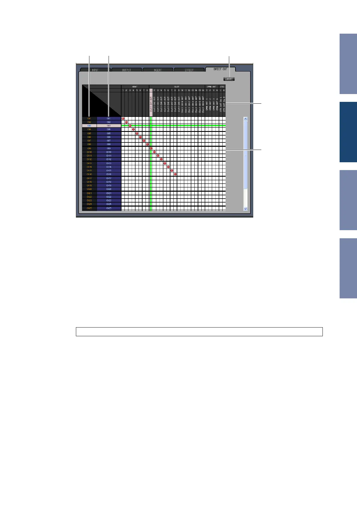 The patchbay is used to patch output ports to the Direct Outs. Active patches are indicated by a red