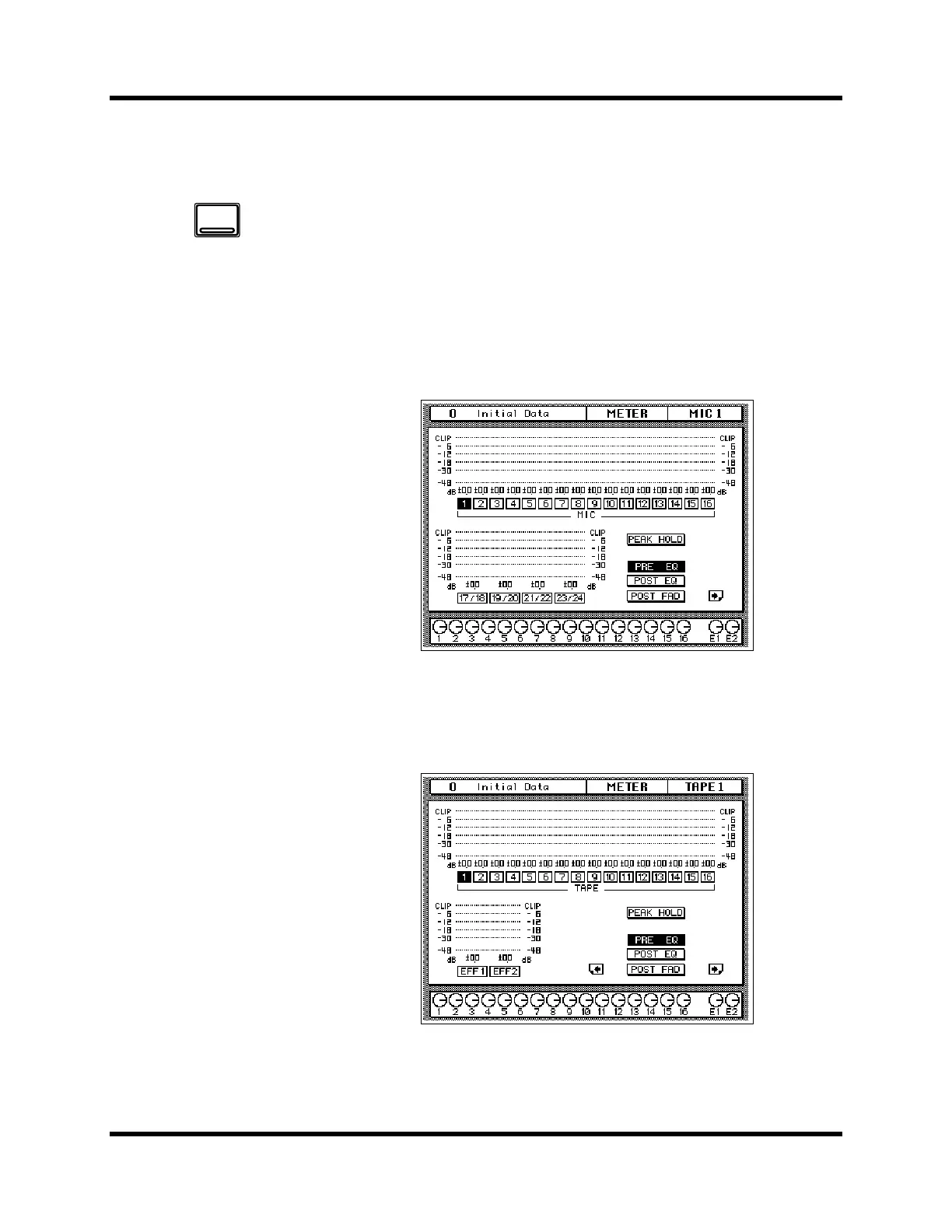 The second screen shows the tape and effect returns – TAPE 1 through 16