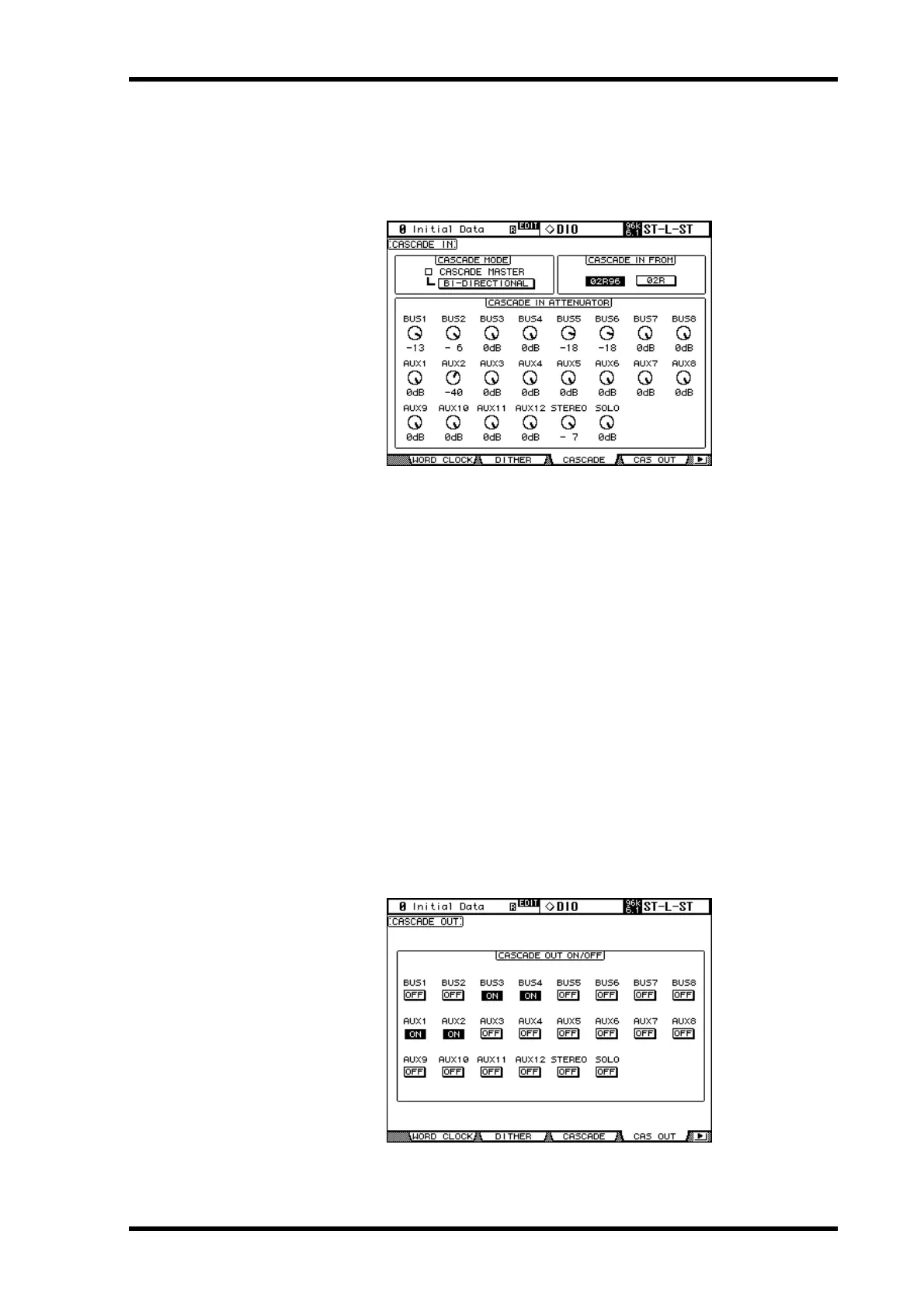 CASCADE MODE: When you want to output the same signals from two 02R96s, turn on