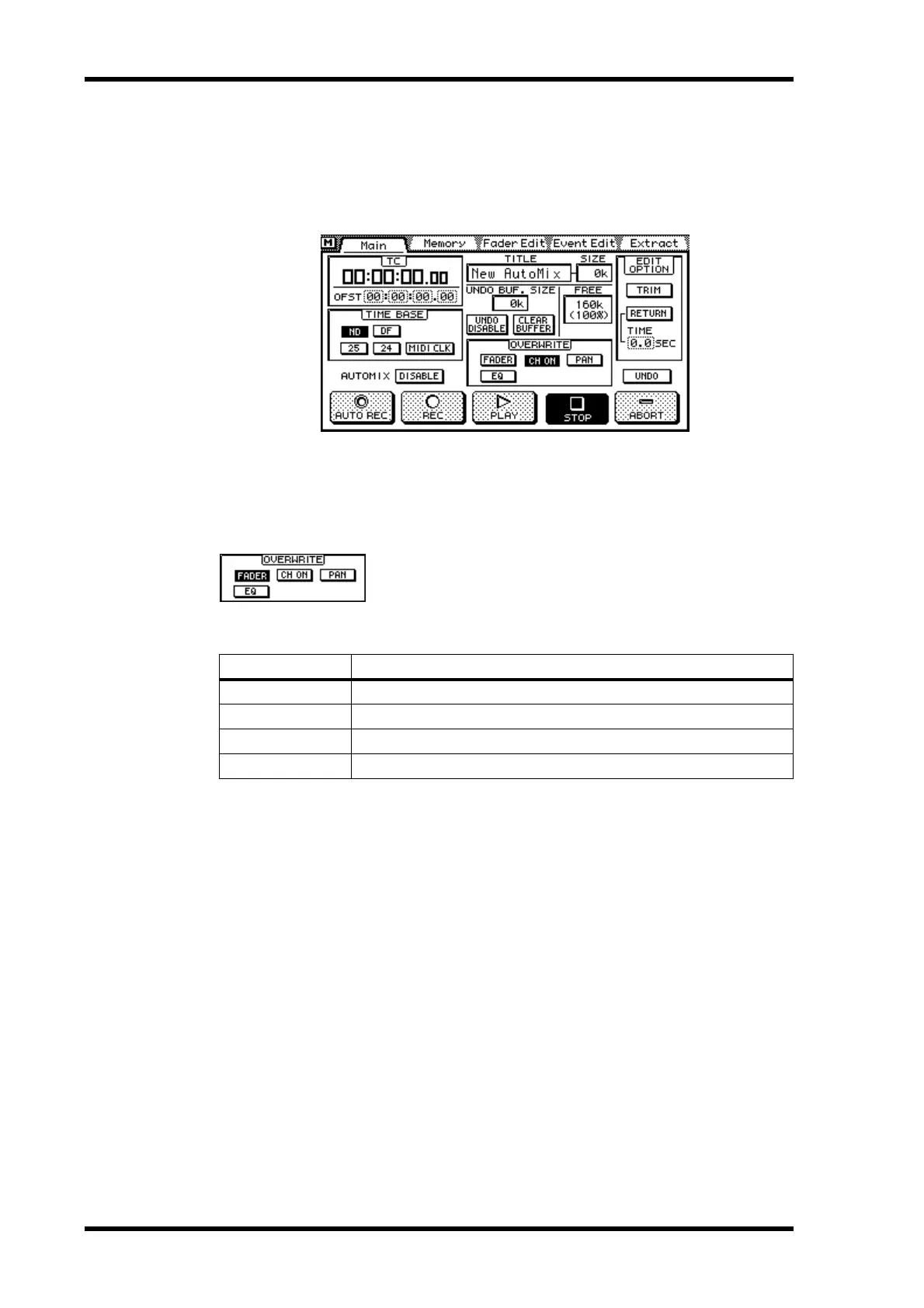 2. Use the cursor buttons to select the OVERWRITE switches, and the