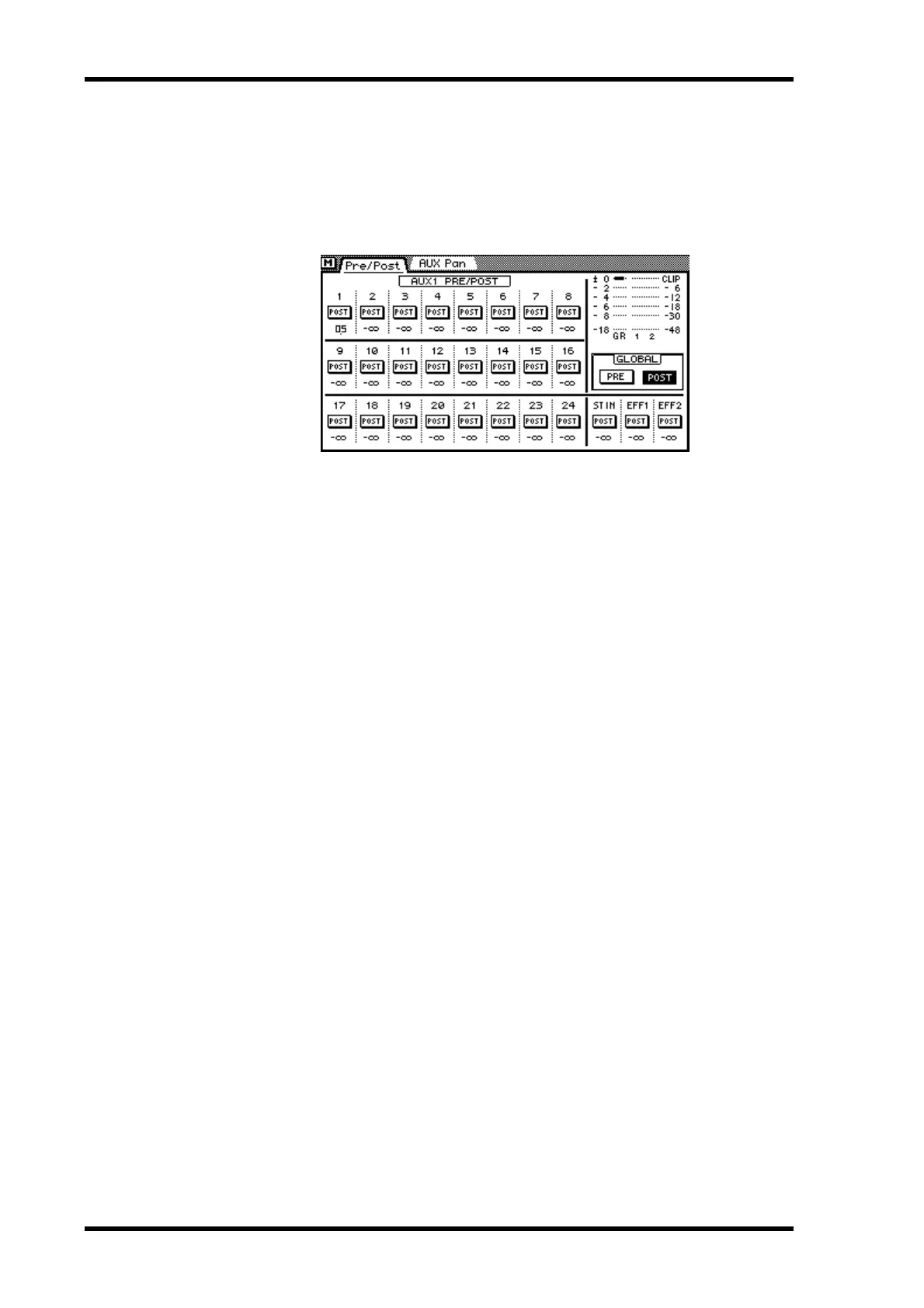 1. Use the [AUX] buttons to locate the Pre/Post pages for aux sends 1 to 4.