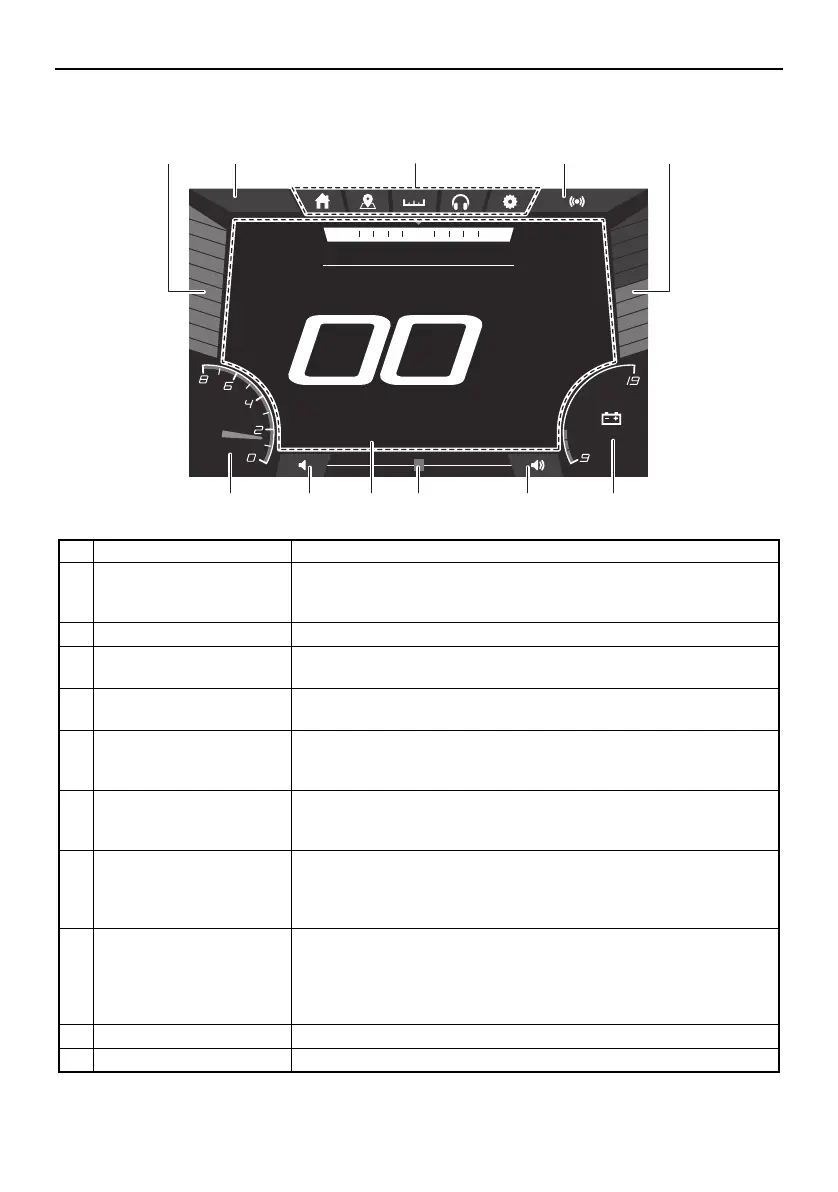 1 Fuel level bar graph Shows the amount of fuel remaining in the fuel tank. Depending on