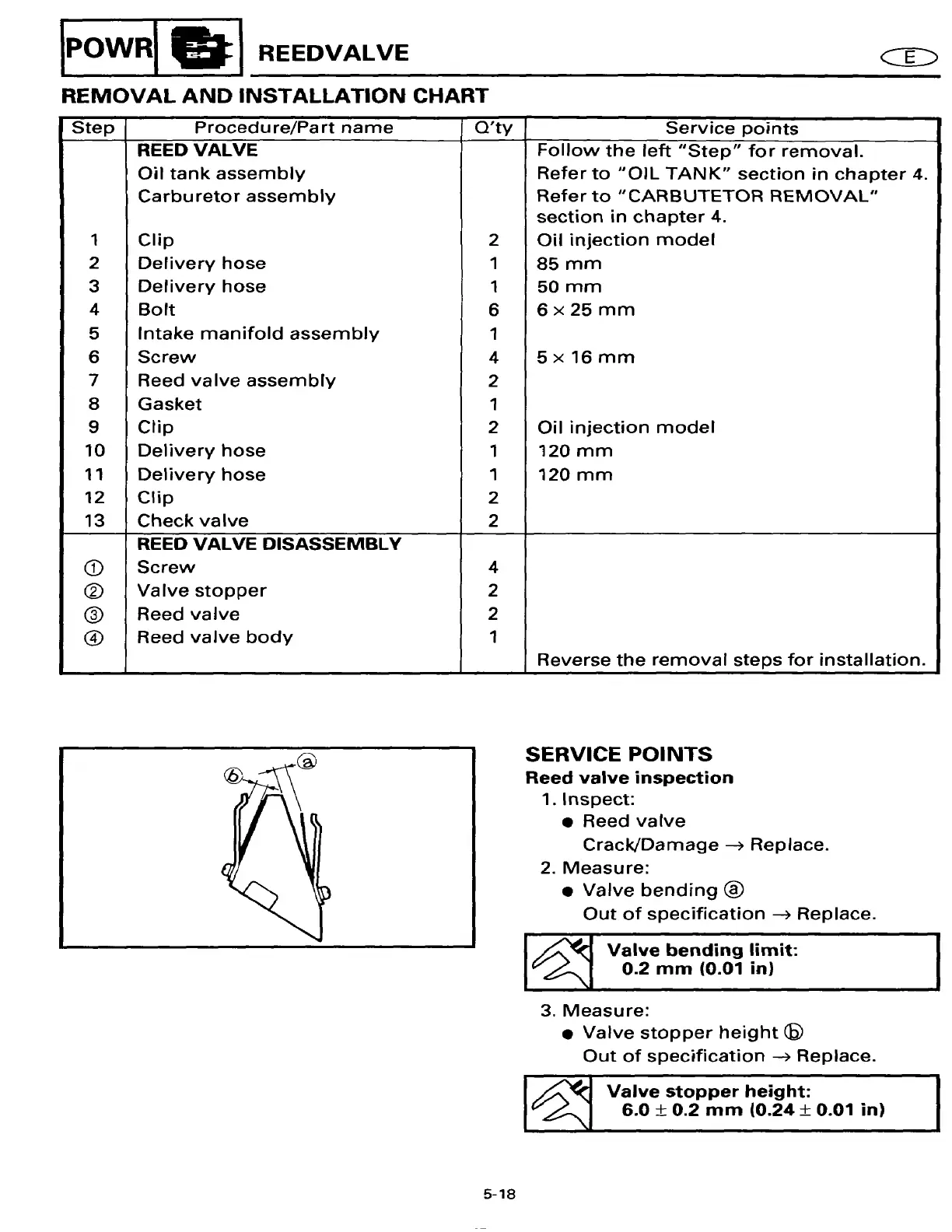 Yamaha 20ESHT2 - REMOVAL AND INSTALLATION CHART; SERVICE POINTS; Reed valve inspection