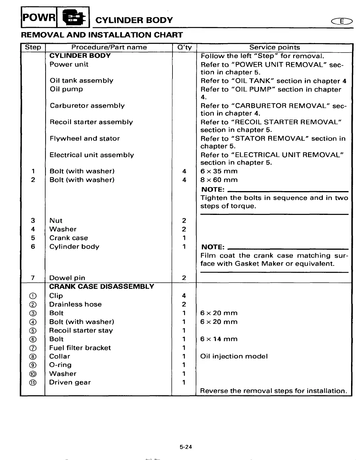Yamaha 20ESHT2 - REMOVAL AND INSTALLATION CHART