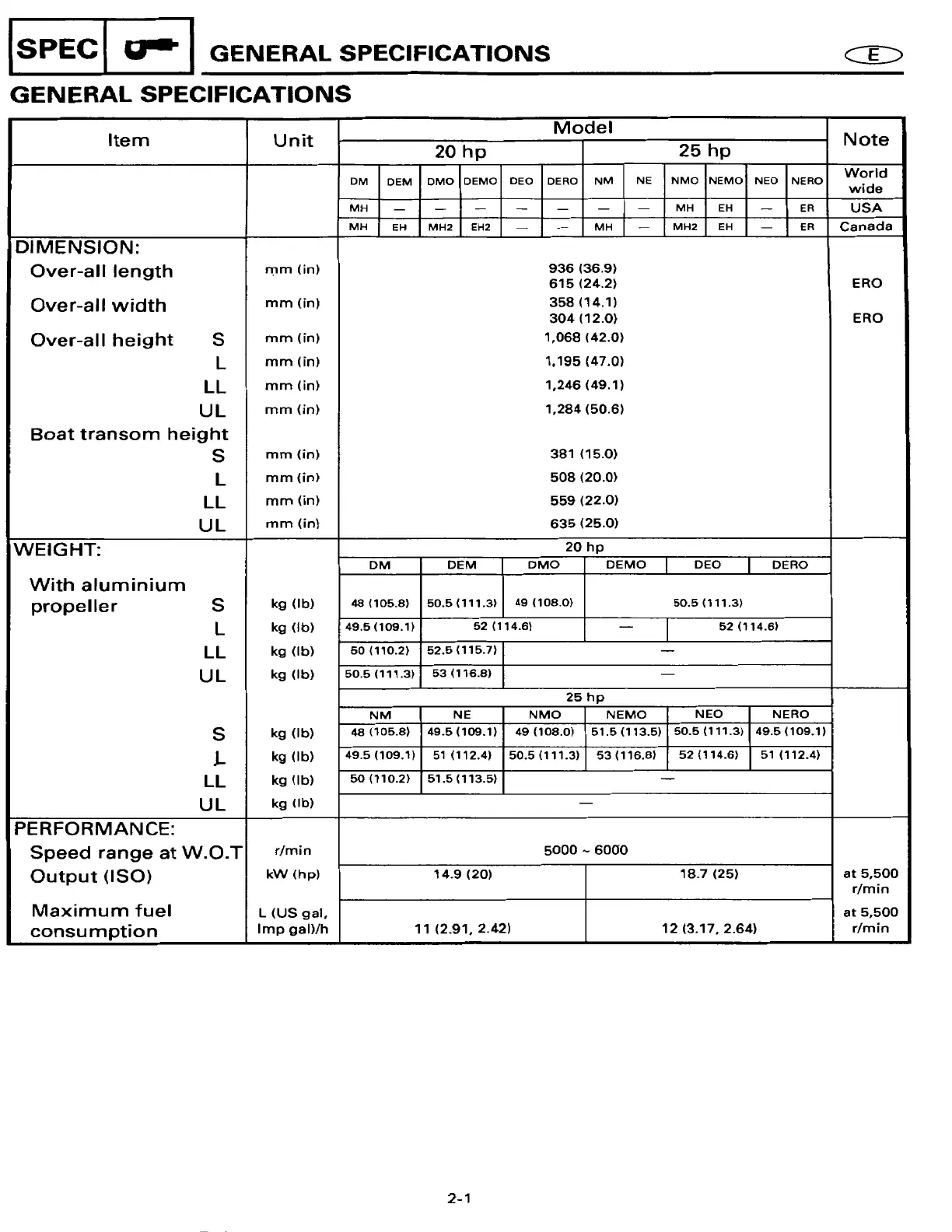 Yamaha 20ESHT2 - GENERAL SPECIFICATIONS