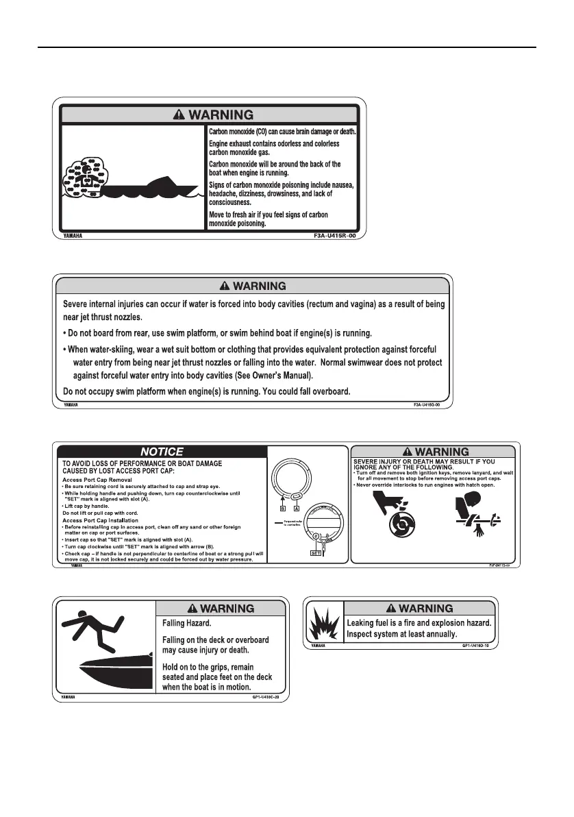 Yamaha 255XE 2021 - Warning Label: Water Entry Hazard; Warning Label: Fire and Explosion Hazard