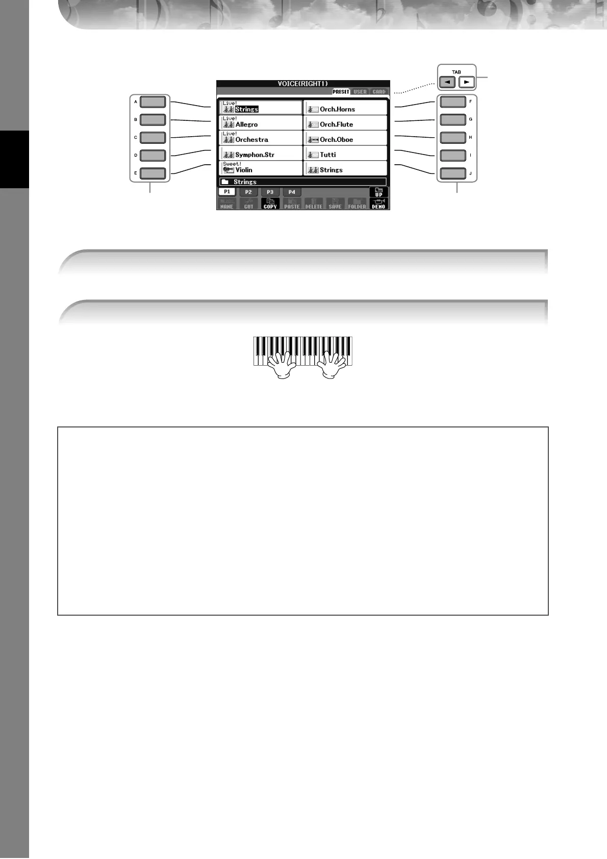2 Press the Voice [USER] button to call up the Voice Selection display and press one of the [A]–[J] buttons to