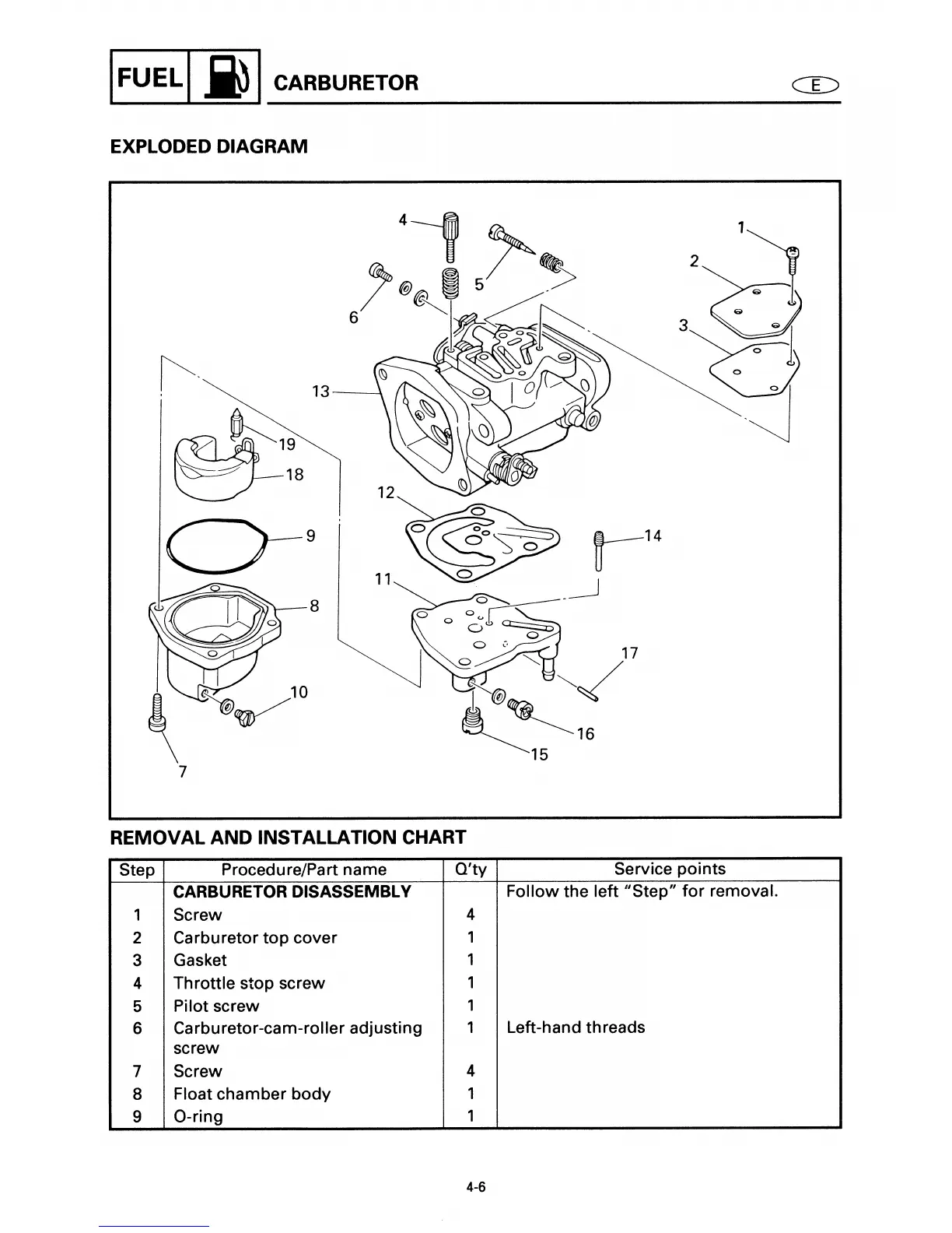 Yamaha 40X - Carburetor Exploded Diagram;Removal and Installation Chart (Cont)