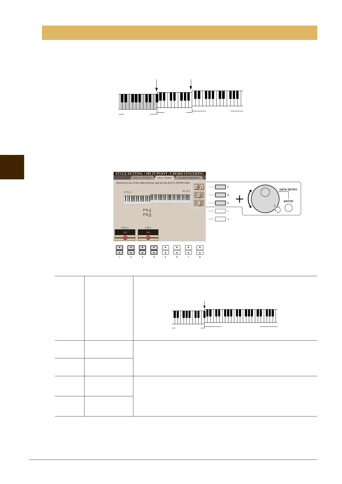 [FUNCTION] → [C] STYLE SETTING/SPLIT POINT/CHORD FINGERING → TAB [E][F] SPLIT