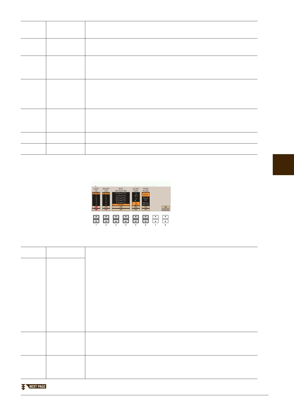 [1 ▲▼] LEFT CH Determines which MIDI channel in the Song data is used for the left-hand/right-