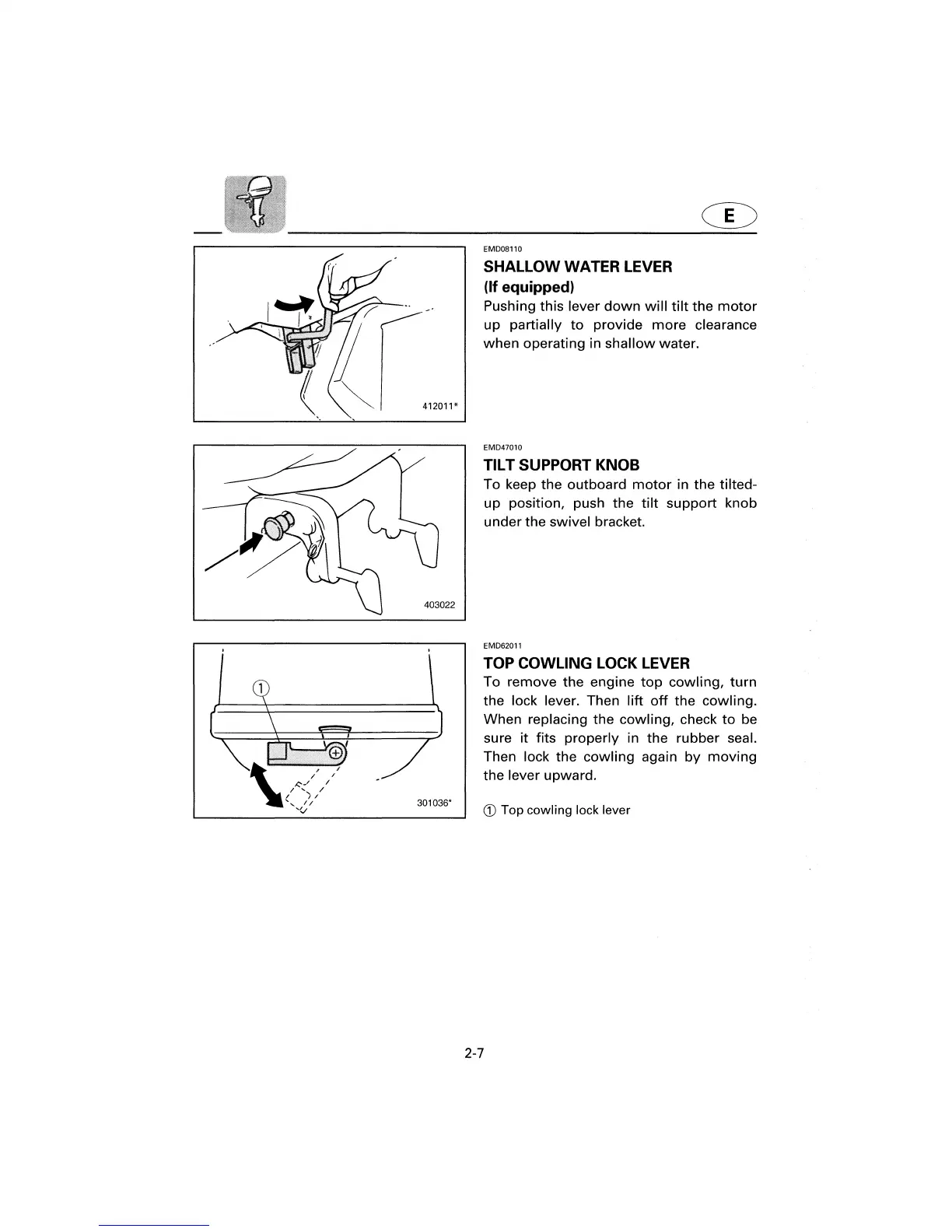 Yamaha 8B - Shallow Water Lever; Tilt Support Knob; Top Cowling Lock Lever