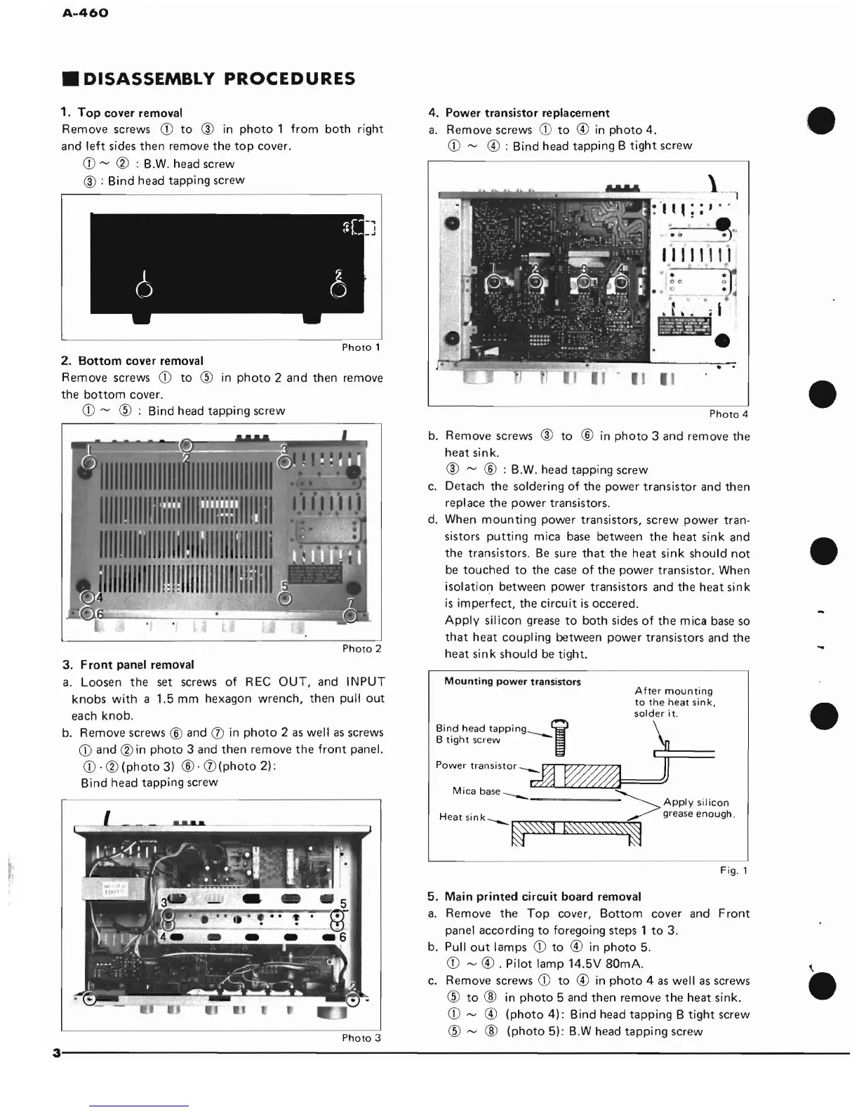 Yamaha A-460 - Disassembly Procedures; Top Cover Removal; Bottom Cover Removal; Front Panel Removal