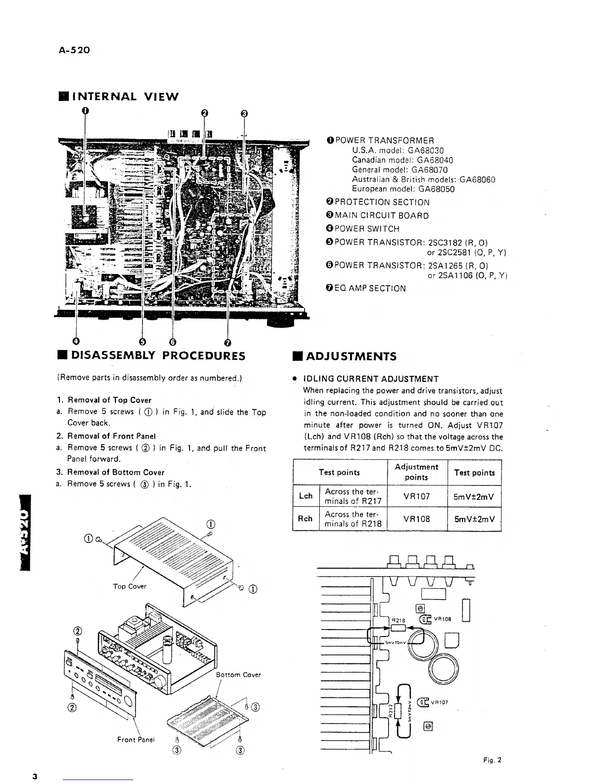 Yamaha A-520 - Disassembly Procedures; Removal of Top Cover; Removal of Front Panel; Removal of Bottom Cover