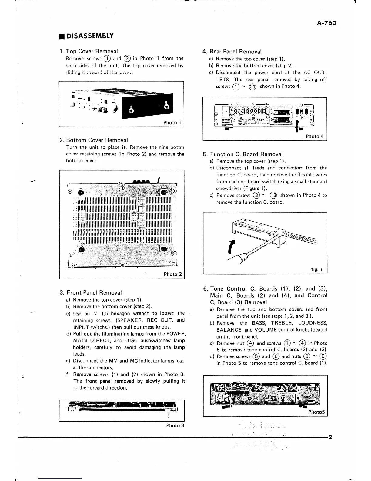 Yamaha A-760 - Disassembly Procedures; Top Cover Removal; Bottom Cover Removal; Front Panel Removal