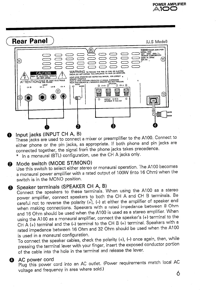 Yamaha A100 - Rear Panel Connections and Switches; Rear Panel Operation