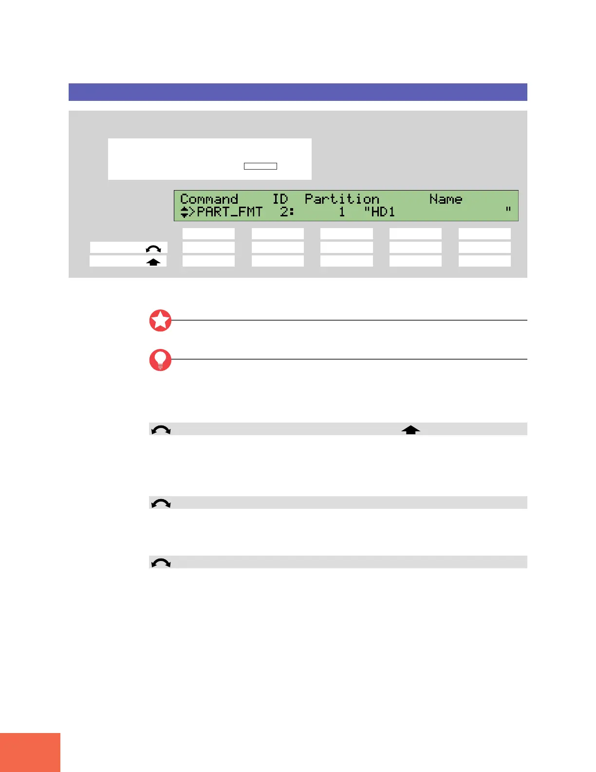 Press the COMMAND key, then turn Knob 1 to select >PART_FMT.