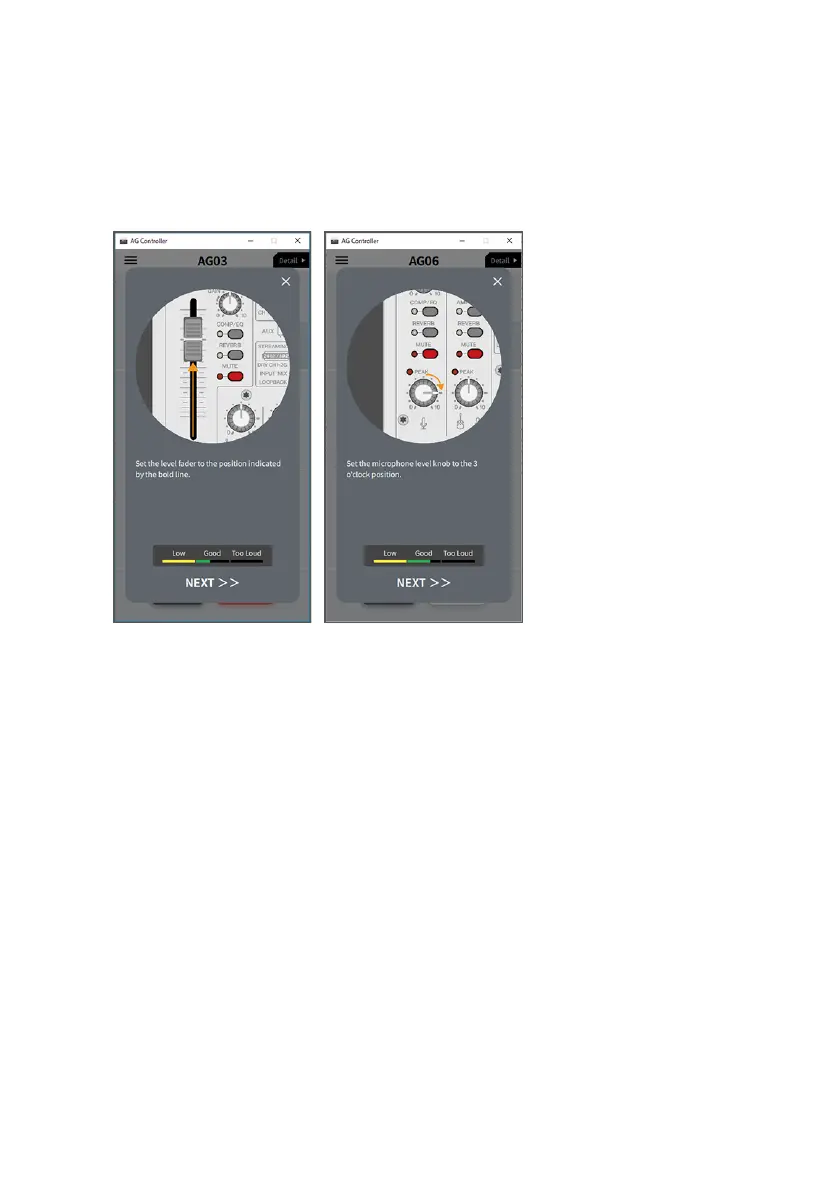 Use the fader (only on the AG03K2) or the level knob to adjust the respective volumes.