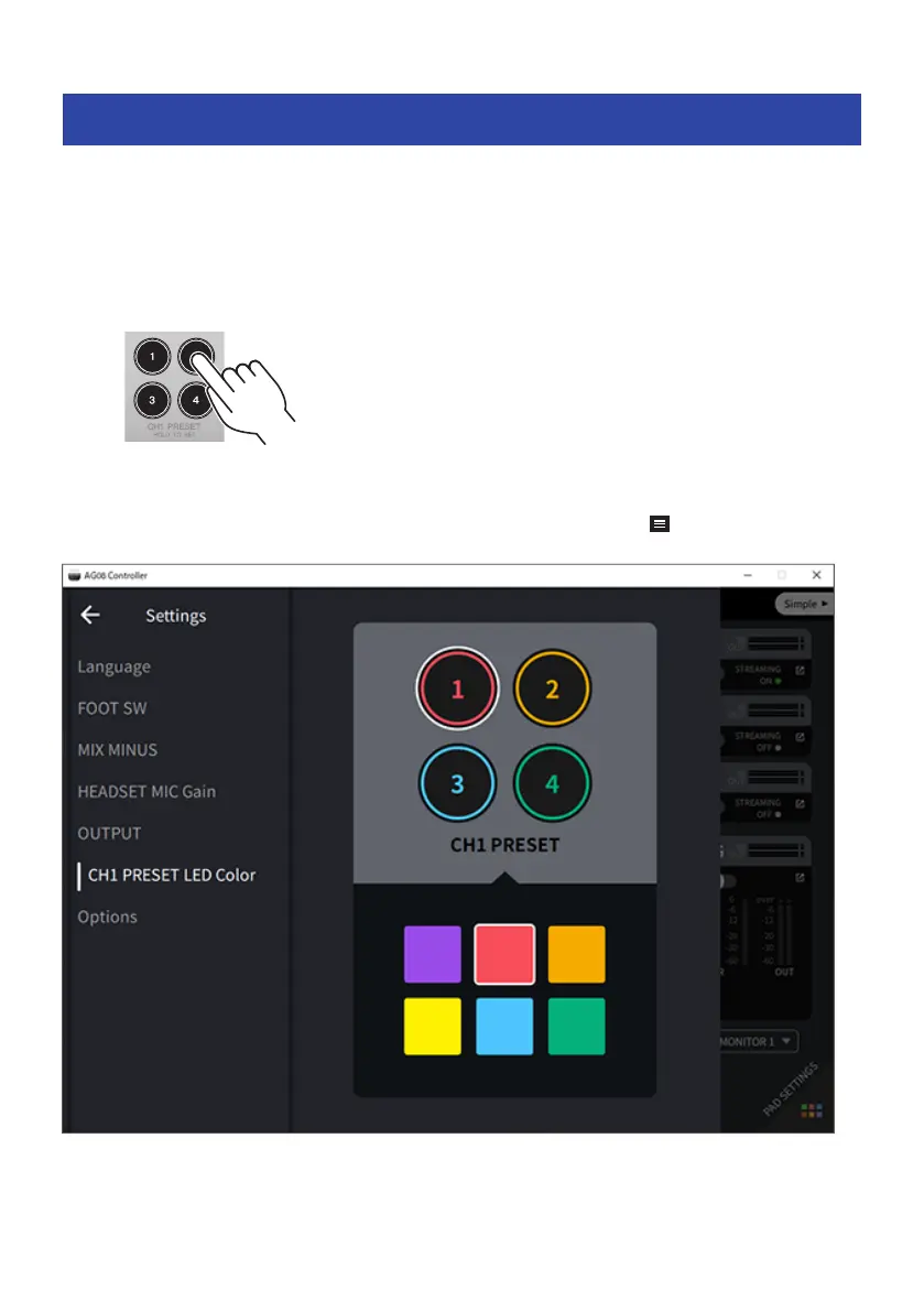 app, and select Settings → CH1 PRESET LED Color to make the settings.