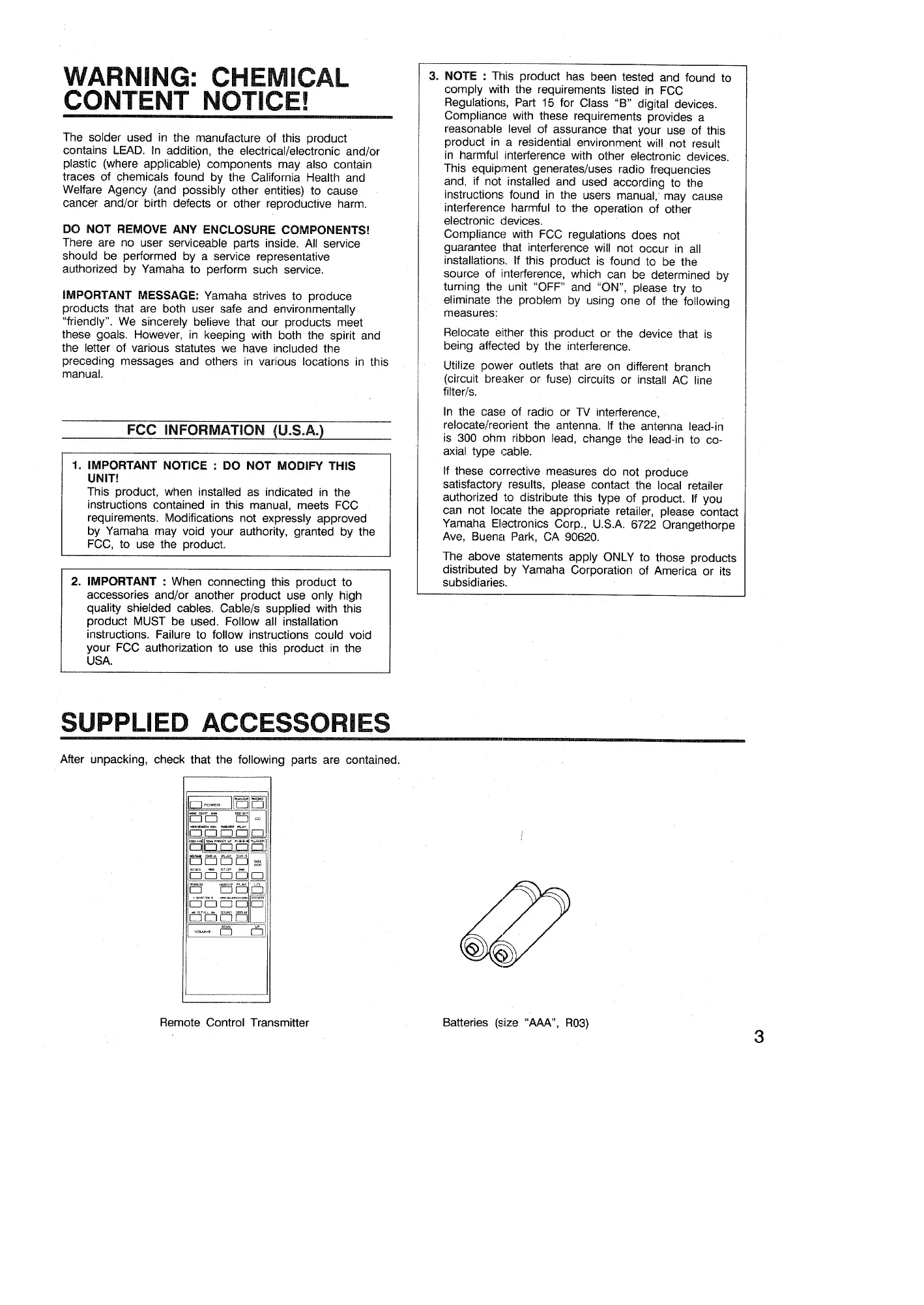 Yamaha AV-85PY - Important Notices and Accessories; Chemical Content Warning; FCC Compliance Information; Supplied Accessories